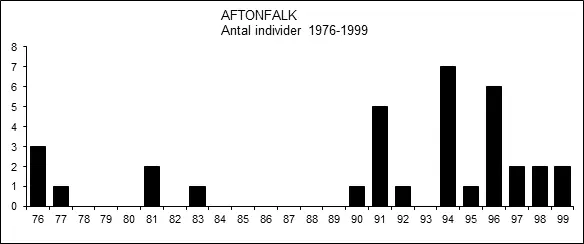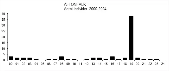 Den 30 augusti 2019 och ett par veckor framåt skedde ett inflöde av aftonfalkar i aldrig tidigare, eller senare, skådad omfattning. Den stora merparten utgjordes av årsungar och upp till fem fåglar kunde emellanåt ses på samma lokal. Många av dem var också rörliga vilket gör summeringen vansklig, men en bedömning landade ändå på 35 individer (FiV 51[2-3]:46). Detta kan jämföras med tidigare årshögsta, 7 ex. år 1994. Geografiskt låg tyngdpunkten i uppträdandet i de sydöstra delarna av landskapet.