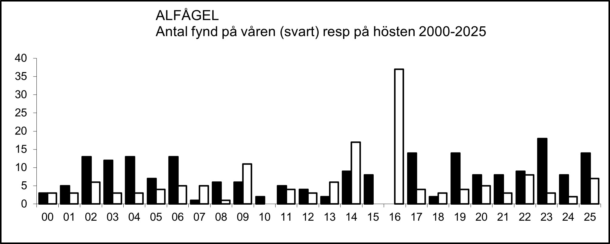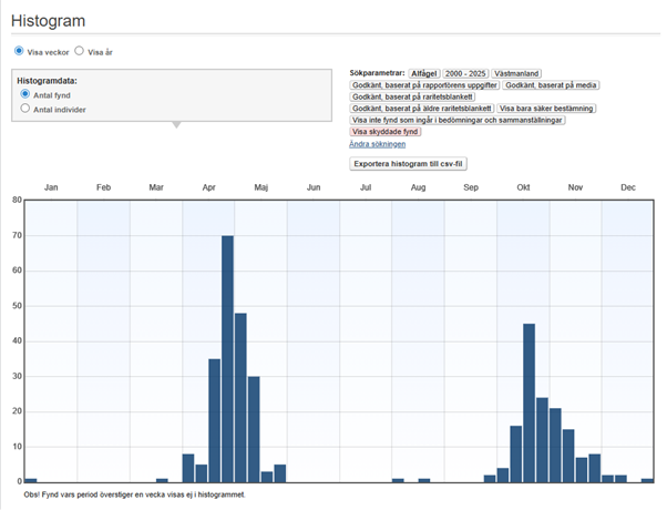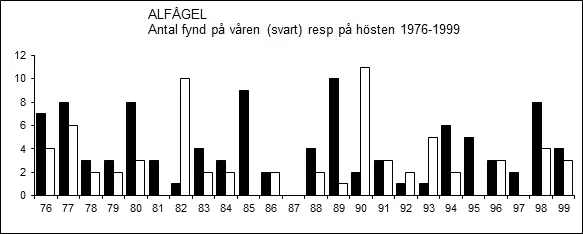 Flest fynd av alfågel har gjorts i april och maj, samt i oktober och november.