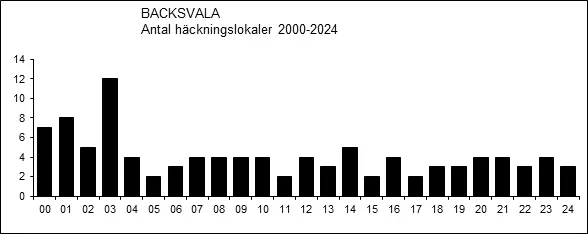 Efter en noggrann inventering år 2003 bedömdes förekomsten uppgå till cirka 400 par (Kenneth Bengtsson 2004; Markus Rehnberg 2005), samma siffra som också Ulf Ottosson m.fl. (2012) kom fram till. Därefter har backsvalan minskat och ligger nu på en betydligt lägre nivå än tidigare. År 2023 rapporterades 181 par på fyra lokaler, vilket var en ökning jämfört med året före då endast 29 häckningar på tre lokaler rapporterades. År 2024 rapporterades sammanlagt 52 par fördelade på tre lokaler. Den största kolonin under perioden 2012-2024 var 80 par vid Grällstaåsen i Kila år 2021 respektive vid Mälby i Västerfärnebo år 2023. Jag bedömer att Västmanlands population av backsvala numera i genomsnitt inte överstiger 100 par.