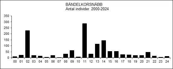 Bändelkorsnäbben är en i det närmaste årlig genomflyttare, främst under sensommar och höst, men i mycket varierande omfattning olika år. Särskilt omfattande uppträdande har varit fallen åtminstone 2002 och 2011.