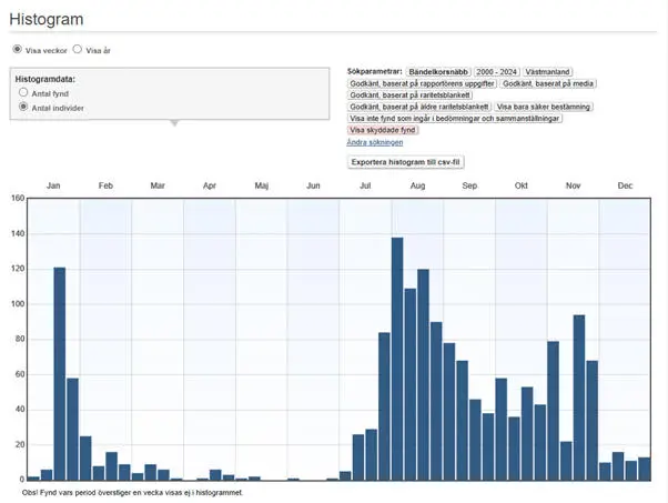 Oftast ses enstaka fåglar eller mindre grupper, ofta dessutom i anslutning till bestånd av lärk Larix decidua. Inte sällan ses också sträckande fåglar. De allra största (minst 20 ex.) flockarna har setts under de kraftigaste invasionerna som infallit under perioden 2000-2024: