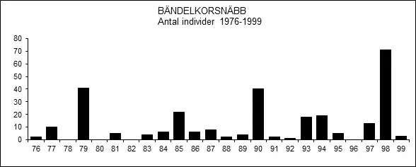 1959 ”Den 13.9.1959 och ca 14 dagar framöver iakttogs 12 bändelkorsnäbbar, övervägande ♀♀ och juv [Lövsveden i Möklinta]. Den 27.9. kom 2 fullt utfärgade ♂♂ hit, och ca 3 veckor senare 1 ad. ♀, som stannade ett par dagar.” (VF 21: 56-57).