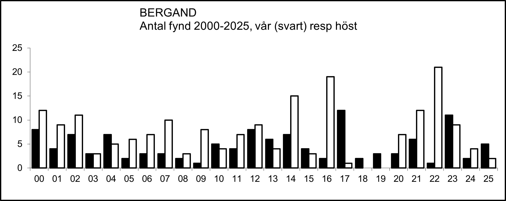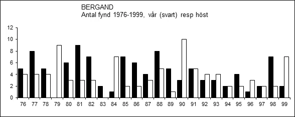Enligt Carl Rudolf Sundström (1868, s. 25) var berganden ”sällsynt höst och vår” i Örebro län. Den första kända fynduppgiften utgörs av 1 ♂ vid Munkängen i Västerås 24-25 mars 1940 (Bengt H. Girell 1952). Under 1950-talet är nio fynd kända, under 1960-talet 14 fynd och under perioden 1970-1975 gjordes 71 fynd.