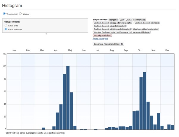 2013 6 (3 ♂♂, 3 ♀♀) Galten vid Suggorna i Kungs Barkarö 30.12 (FiV 45[2-3]:23).