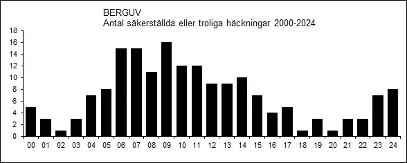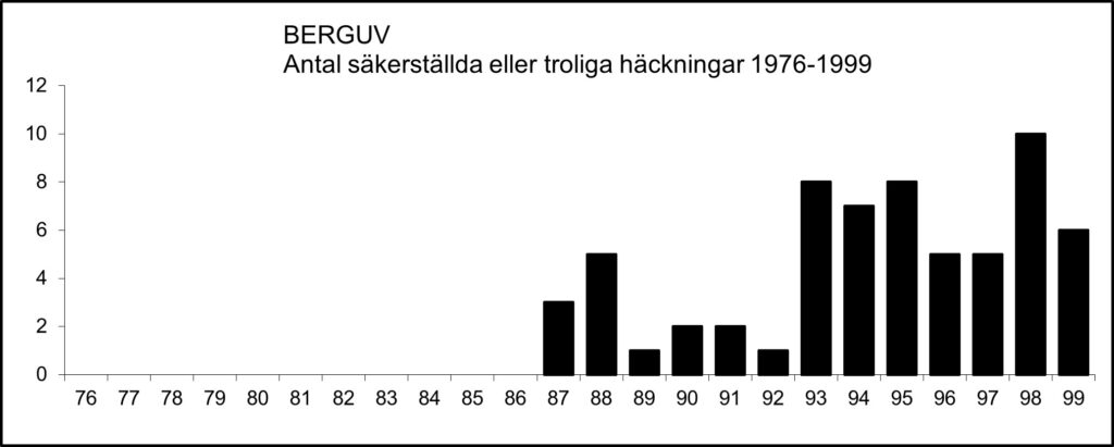 Under perioden 1976-1986 föreligger inte en enda rapporterad häckning, men därefter har häckningar rapporterats årligen i varierande antal.