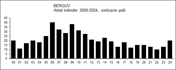 Berguven är i hög grad stannfågel och etablerade par kan ses och höras året om på häckningslokalen.