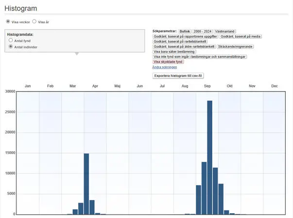 Mediandatum för första vårobservation av minst 10 ex., fynd före 1 mars exkluderade, under perioden 1976-2024 är den 23 mars. Mediandatum för sista höstfynd av minst 10 ex. under samma period är den 24 oktober.