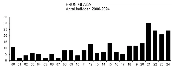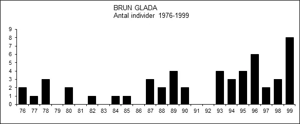 De första bruna gladorna anländer vanligen i april och det allra tidigaste fyndet gjordes vid såväl Köping som Virsbosjön i Ramnäs den 26 mars 2015 (FiV 47[2-3]:34). Flest iakttagelser görs från mitten av april till början av juni och de sista ses i början eller slutet av september. Det allra senaste fyndet gjordes vid Fröstboviken i Sala den 5 oktober 1990 (FiV 22:101; VF 50[6-7]:36). Ett överraskande vinterfynd gjordes dock år 2021: