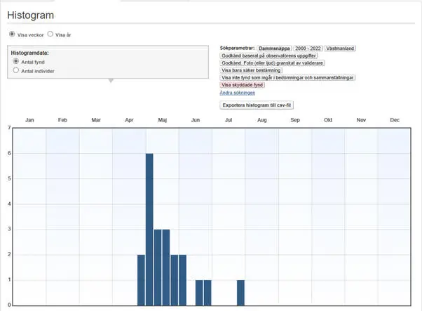 2019 1 ad. r. Asköviken vid Lövsta i Dingtuna 7-10.5 (FiV 51[2-3]:38; VF Suppl. 60:113).