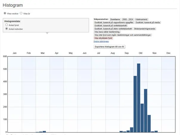 De högsta (minst 100 ex.) dagssummorna av sträckande domherrar under perioden 2000-2024: