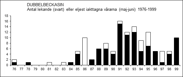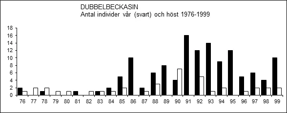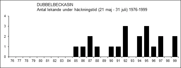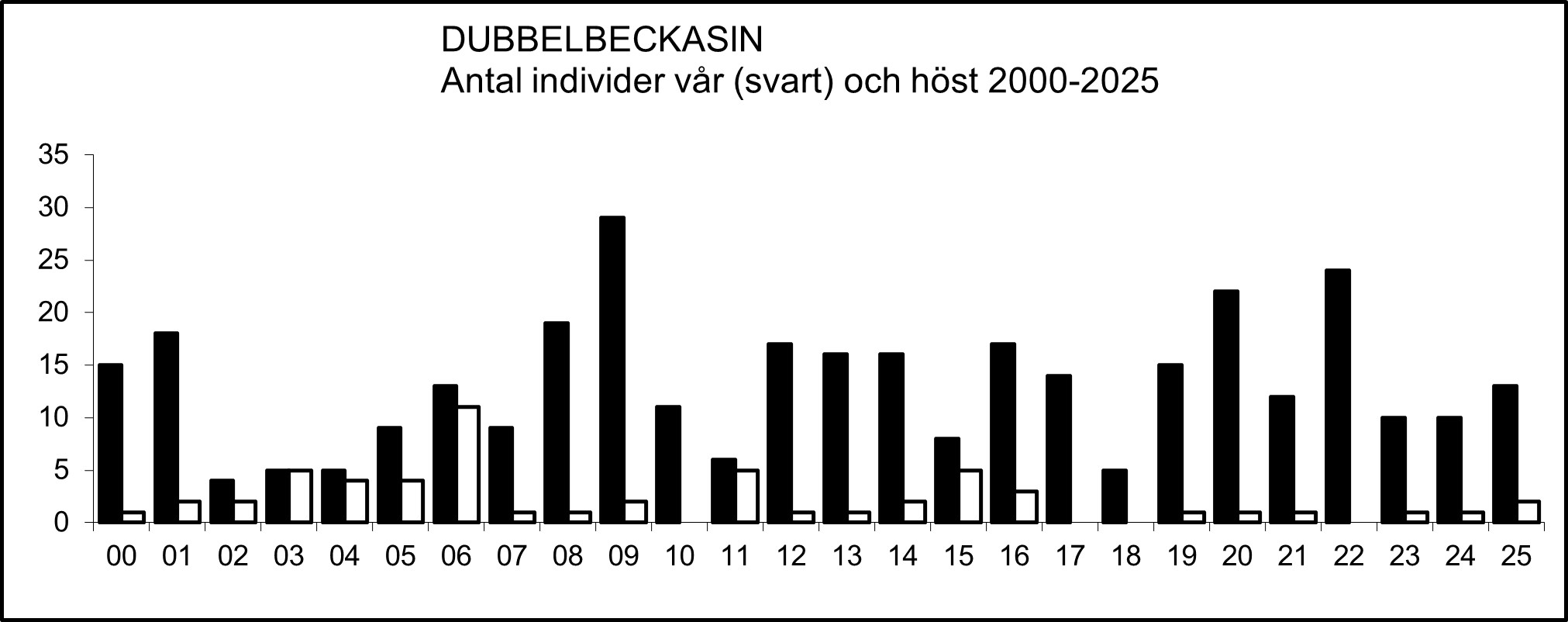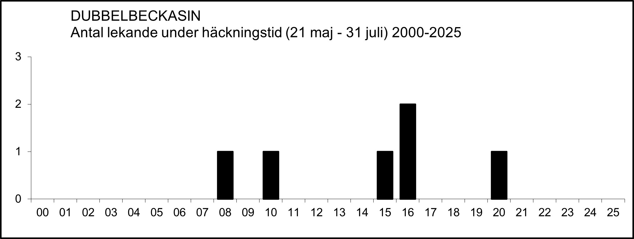 Dubbelbeckasinen uppträder sällsynt som genomflyttare vår och höst, men har observerats årligen sedan 1983. Lek har förekommit troligen varje år. Det är dock mycket tveksamt om någon häckning ägt rum under perioden 2000-2025, även om enstaka sena vårfynd och sommarfynd gjorts och antalet lekande fåglar har tenderat att öka. Det torde likväl vara sannolikt att merparten av fåglarna, inklusive de lekande, är på genomflyttning. Under perioden 2000-2025 har lekande dubbelbeckasiner noterats sent på året (häckningstid), fr.o.m. den 21 maj, fem (5) av åren. Sent uppträdande dubbelbeckasiner kan dock, åtminstone i viss utsträckning, vara ett uttryck för försenad flyttning.