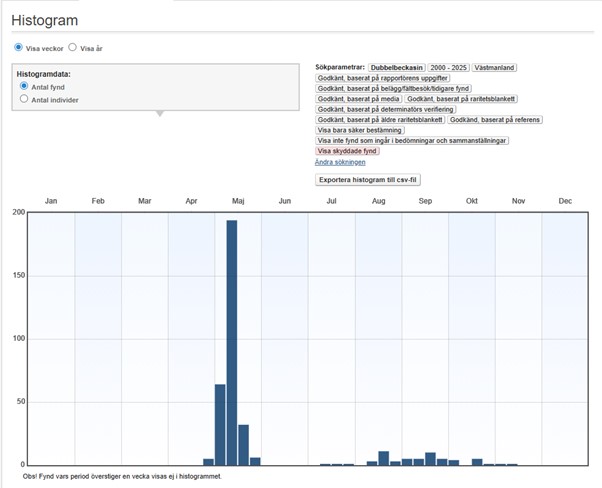 Mediandatum för första respektive sista höstfynd under perioden 1976-2025 är den 10 september respektive den 20 september.