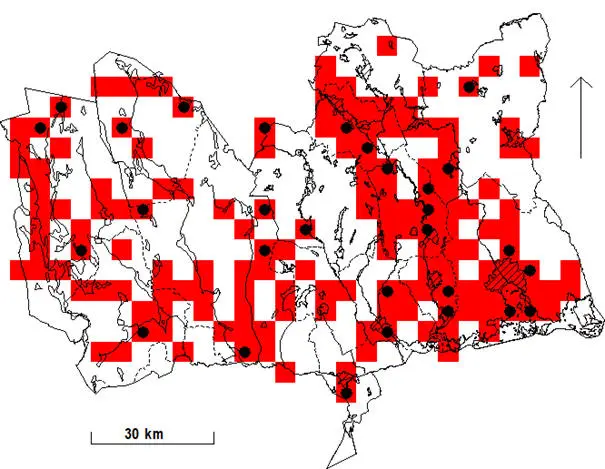 Rutor (5×5 km) med fynd under häckningstid 1974-1984. Svart prick anger ruta med säkerställd häckning.