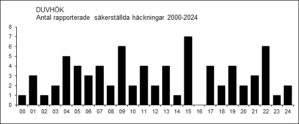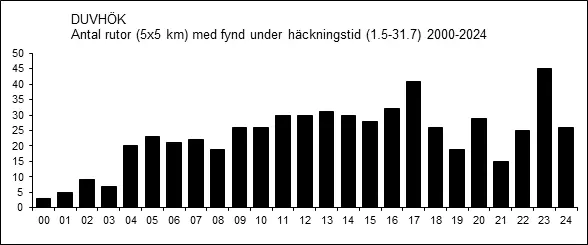 Västmanlands population av häckande duvhök tycks inte ha genomgått någon större förändring de senaste två decennierna, men antalet rapporterade fynd under häckningstid har ökat något. De låga värdena åren närmast efter millennieskiftet i figurerna nedan beror självfallet på underrapportering. Antalet rapporterade säkerställda häckningar varierar stort mellan olika år men är i genomsnitt ganska få och ingen tendens synes finnas heller där.
