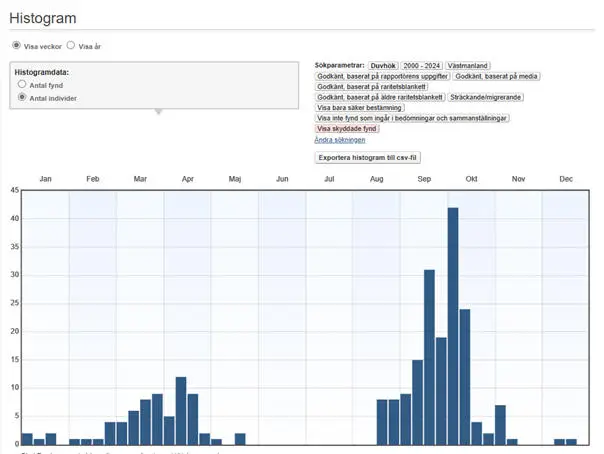 Veckovis fördelning av duvhökar som har rapporterats som sträckande 2000-2024.