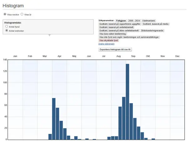 Sträckande fiskgjusar vår och höst ses oftast ensamma och dagsummorna överstiger sällan fem fåglar. De högsta (minst 10 ex.) dagssummorna 2000-2024: