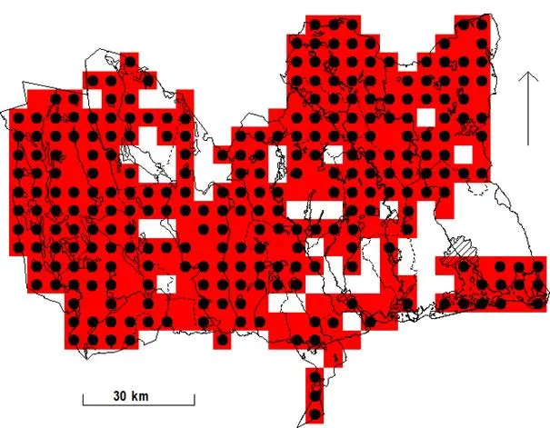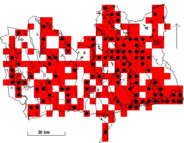 Rutor (5×5 km) med fynd under häckningstid och i lämplig häckningsmiljö 1974-1984. Svart prick anger ruta med säkerställd häckning.