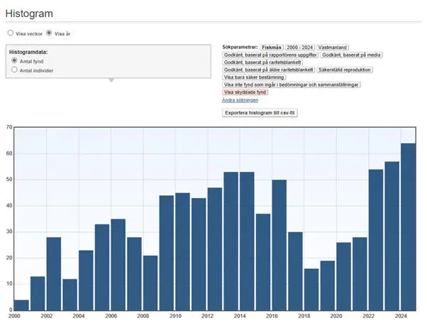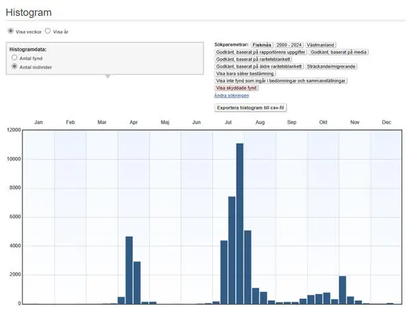 Veckovis fördelning av fiskmåsar som har rapporterats som sträckande under perioden 2000-2024.