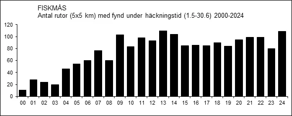 Antalet rapporterade säkerställda häckningar av fiskmås synes ligga rätt stabilt över tid, även om variationerna mellan olika år är stora. Antalet så kallade atlasrutor (5×5 km) med fynd under häckningstid har dock legat rätt stabilt under samma period, med undantag för de första årens låga värden som förstås beror på underrapportering.