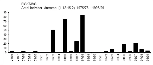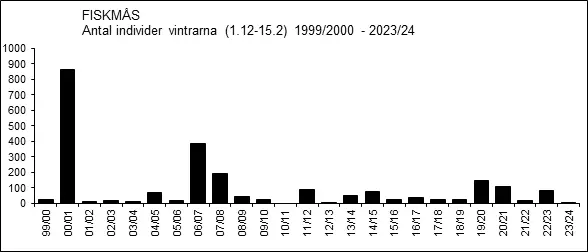 Vinterfynd har gjorts nära nog årligen efter millennieskiftet men i starkt varierande antal. Exceptionellt många fiskmåsar, 861 ex., rapporterades vintern 2000/01 och vintern 2006/07 rapporterades 386 ex. medan inte en enda sågs vintern 2010/11.