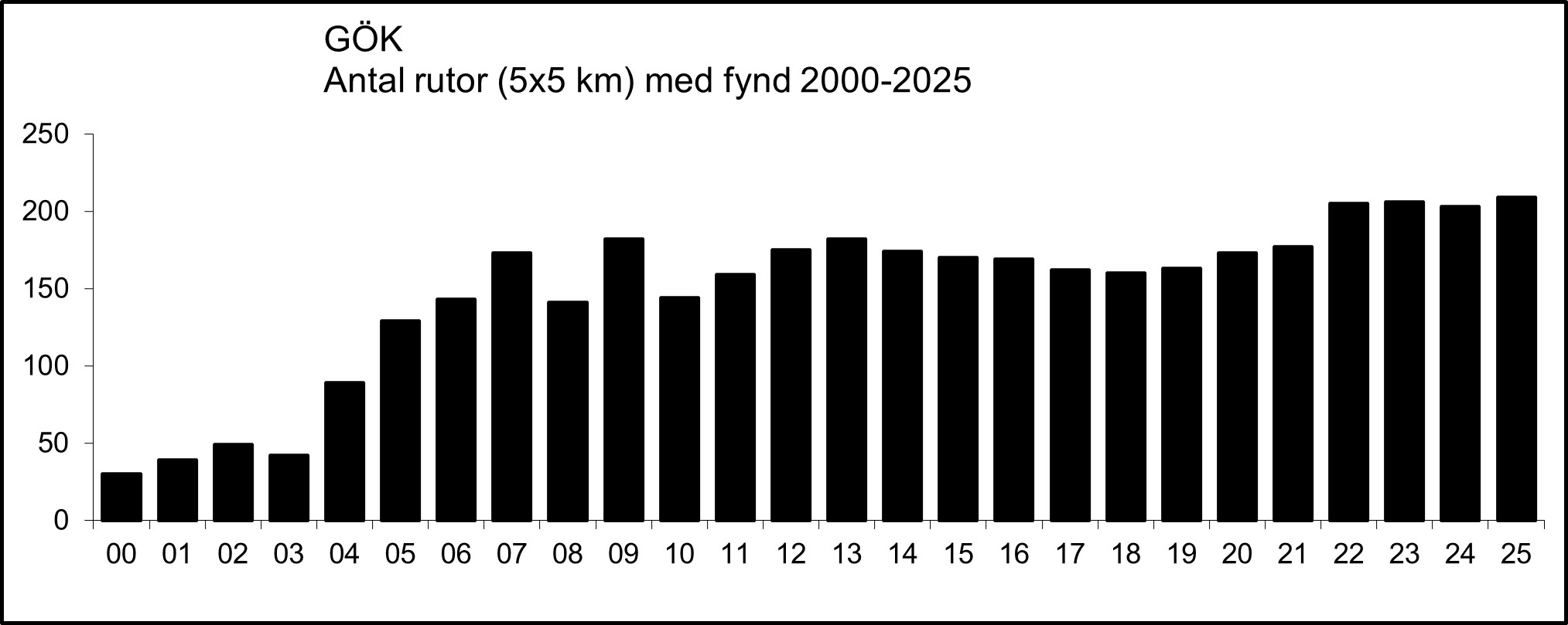 I figuren nedan visas antalet rutor (5×5 km) per år med fynd av gök. De förhållandevis låga antalen åren närmast efter millennieskiftet är med största sannolikhet missvisande och beror på underrapportering.