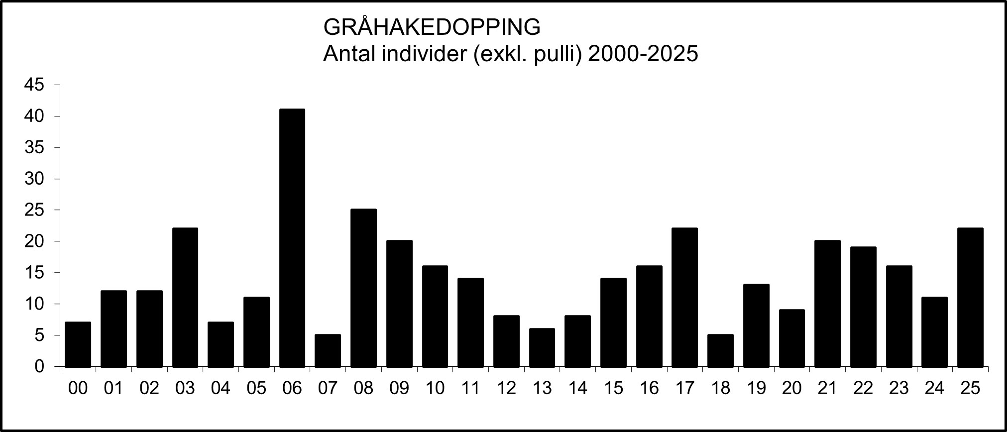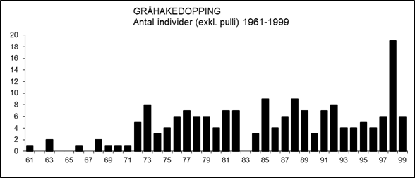 Under 1970-talets första hälft noterades gråhakedoppingen varje år, varav under häckningstid vid Gussjön i Fläckebo årligen 1973-1975: 1 ex. 20-23 maj samt 21 juni – 2 juli 1973 (Stefan Björklund, opubl.); 1 ex. 21 april – 18 augusti 1974 (Lars Lindell 1975h); 1 ex. 27 april – 30 augusti 1975 (MVOF 7[2]:1). Därtill kan nämnas ett på året sent fynd vid Södra Hörken i Grängesberg/Ljusnarsberg 24-25 november 1972 (VF 32:228; Kjell Bylin 1975, s. 248). Det första fyndet någonsin vid Mälaren gjordes vid Fullerö i Västerås-Barkarö så sent som den 29 april 1975 (MVOF 6:24).