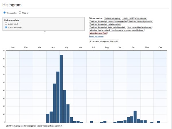 Novemberfynd är sällsynta och sju sådana föreligger under perioden 2000-2025. Vinterfynd (december-mars) är likaledes mycket ovanliga och följande har gjorts under samma period: