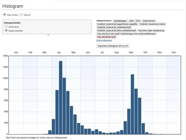 Större (minst 10 ex.) ansamlingar har under perioden 2000-2024 rapporterats vid 23 tillfällen, varav fyra gånger vardera höstarna 2022 och 2023 och hela 11 gånger hösten 2024. De allra största (minst 20 ex.) ansamlingarna: