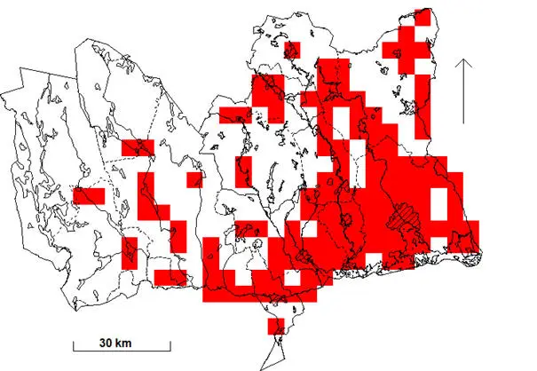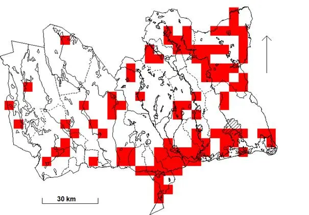 Rutor (5×5 km) med fynd under häckningstid 1974-1984.