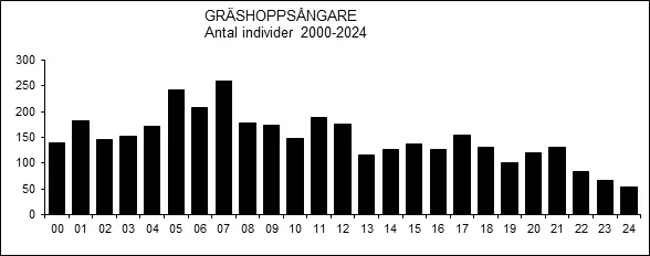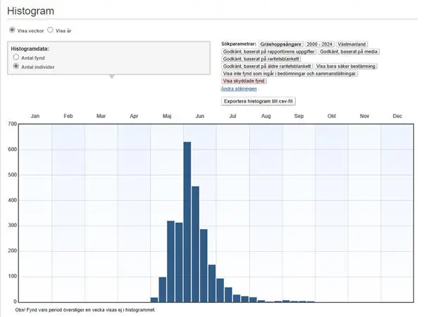 Veckovis fördelning av gräshoppsångare 2000-2024.
