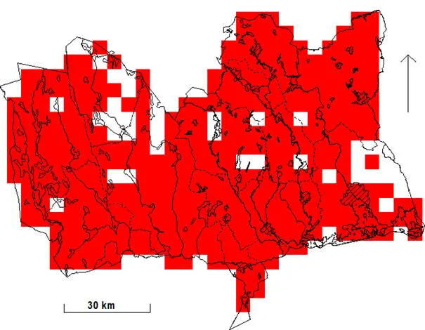 Inventeringsdata saknas helt från Västmanland, varför jag får förlita mig på den bedömning på 45 000 par som har gjorts av Ulf Ottosson m.fl. (2012). Figuren nedan antyder en ökning under det senaste decenniet.