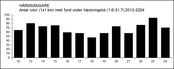 I övrigt rapporterades sjungande härmsångare årligen 1957-1959 i Västerås-Barkarö (Hans-Olof Hellkvist m.fl., opubl.). Ännu i slutet av 1950-talet ansågs härmsångaren ha sin norra svenska utbredningsgräns i Västmanland: ”Sydliga arter, som ha sin normala nordgräns inom landskapet, äro stenknäck, näktergal, gulsångare och kungsfiskare.” (Bengt H. Girell 1958, s. 107); ”Nordgränsen för häckningsområdet går i stort sett genom Värmland, Dalarna, Västmanland och Gästrikland.” (Kai Curry-Lindahl 1959-63, s. 1843).