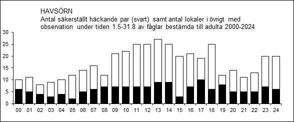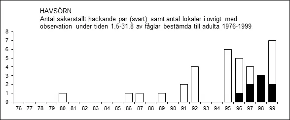 Havsörnen återkoloniserade Västmanland i mitten av 1990-talet efter 60-70 års frånvaro som häckande. Den första säkerställda häckningen rapporterades 1996 från en lokal i Fläckebo (Thomas Pettersson 1996c). Häckningen lyckades och en unge kom på vingarna (FiV 28:133). Ett par har därefter häckat i samma område årligen till och med 2010, av och till även därefter. Efterföljande år etablerades fler par. Ett halvdussin revir rapporterades under perioden 1995-1999, samtliga i landskapets östra halva. Rapporterade häckningar tillsammans med observationer av adulta fåglar under sommarmånaderna (1 maj – 31 augusti) under perioden 1976-1999 bekräftar bilden av att återetableringen av havsörn i Västmanland tog sin början på allvar i mitten av 1990-talet.