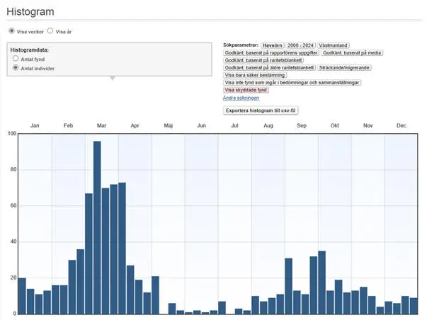 De första flyttande örnarna om hösten brukar ses från och med början av september. Sträcket tycks sedan vara utdraget och i november sker en påtaglig ökning av antalet observationer och först i slutet av december tycks alla vinterörnarna vara på plats. Vårsträcket kulminerar i början eller mitten av mars, men sena sträckare, ibland även adulttecknade individer, kan ses så sent som i maj, även om yngre fåglar dominerar bilden stort i april och maj. Även de yngre fåglarna tycks i hög utsträckning dra bort från Västmanland och under sommarmånaderna överväger observationer av adulta fåglar, inklusive de som häckar eller håller på att etablera sig som häckande.