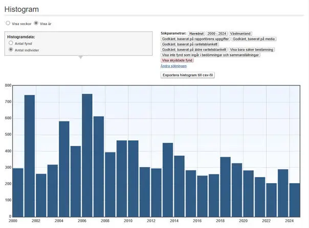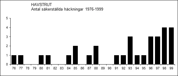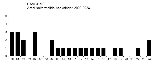 Säkerställda häckningar har rapporterats från sammanlagt sex lokaler i Mälaren 2000-2024, som mest tre (3) ett enskilt år. Martin Green (1988) antog att 5-10 par häckade årligen enbart i den del av Mälaren som hör till Västerås kommun, vilket jag tror var en överskattning. Häckning är relativt enkelt att konstatera om så är fallet, men häckningarna äger i regel rum på isolerade holmar och skär som sällan och oregelbundet besöks av rapporterande ornitologer. Detta kan vara en förklaring till att förekomst saknas vissa år i figuren nedan. Å andra sidan antyder figuren en minskning under perioden. Denna minskning korrelerar också till att antalet sedda havstrutar i övrigt har minskat under motsvarande period. Ulf Ottosson m.fl. (2012) har beräknat antalet par i Västmanland till sju (7), en siffra som jag väljer att nedjustera till fem (5).