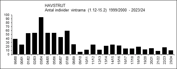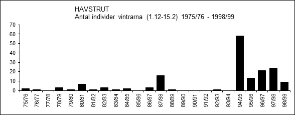 Vinterfynd (1.12-15.2) har gjorts årligen sedan mitten av 1990-talet för att dessförinnan ha noterats oregelbundet. Antalet individer vintertid ökade snabbt under 1990-talets andra halva och som mest noterades närmare ett hundra fåglar vintern 2003/04. Sedan mitten av 2000-talets första decennium har havstruten åter minskat i antal under vinterperioden. Vinterfynden görs nästan uteslutande i anslutning till Mälaren.