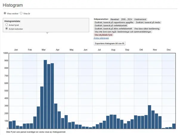 1999 Västeråsfjärden i Västerås 6-14.3, som mest 36 ex. (35 ad., 1 2K) 14.3 (Västmanlands rapportkommitté).