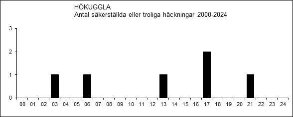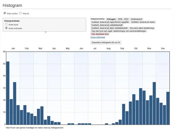 Veckovis fördelning av hökugglor under perioden 2000-2024.