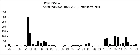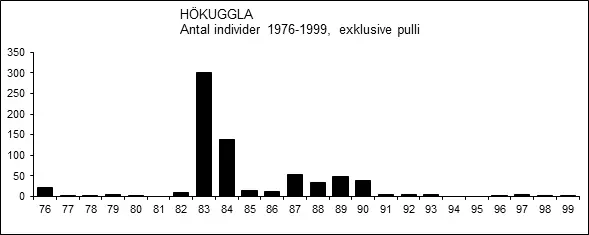 Under perioden 1971-1974 rapporterades hökuggla årligen med 1-2 ex., men hösten 1975 i betydligt högre antal än vanligt. Då rapporterades minst 13 olika individer från Skogslåglandet under perioden 11.10-31.12, men ingen från vare sig Mälarområdet eller Bergslagen.