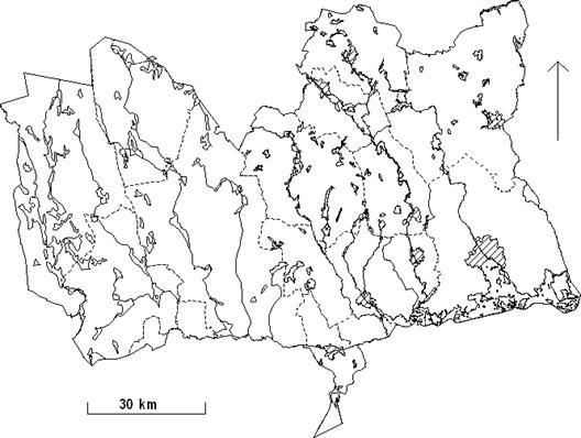 Utbredningen hos landskapets häckfåglar, regelbundna såväl som tillfälliga, illustreras med kartor. Grundkartans utseende framgår av figuren. Den visar konturerna av de kommuner, eller delar av kommuner, som innefattas i landskapet och de större sjöarna och vattendragen. Vad gäller frågan om landskapets geografiska avgränsning har jag valt att följa Lantmäteriverkets Röda kartan. Detta innebär bl.a. ibland ganska stora avvikelser mot gällande administrativa gränser. Det innebär också en bristande överensstämmelse med ”regionalfaunorna” i Dalarna och Södermanland.