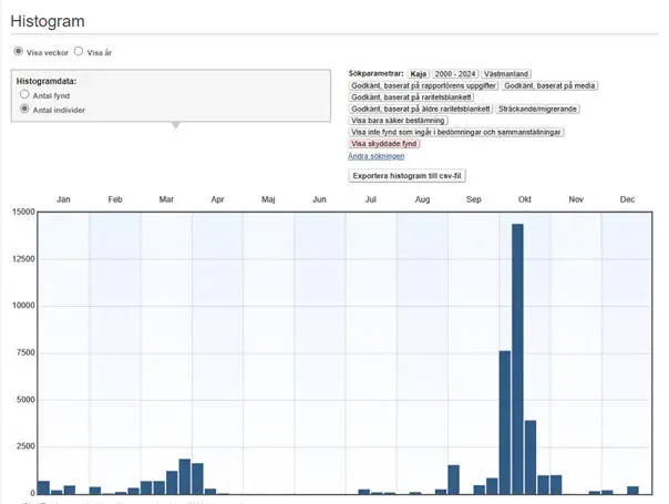 De högsta (minst 1 000 ex.) dagssummorna av sträckande kajor, höstarna 2000-2024: