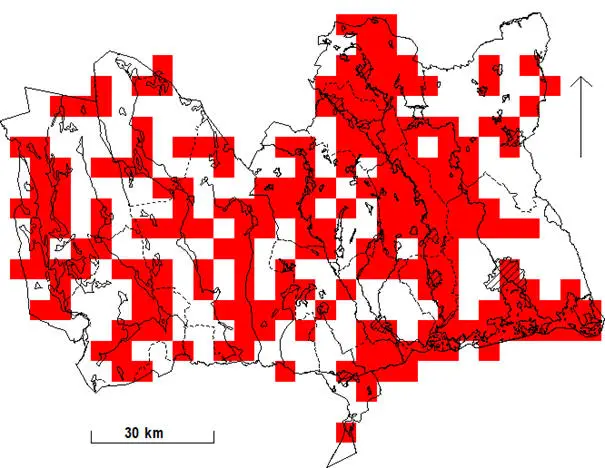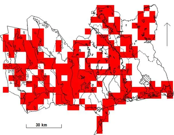 Rutor (5×5 km) med fynd under häckningstid 1974-1984.