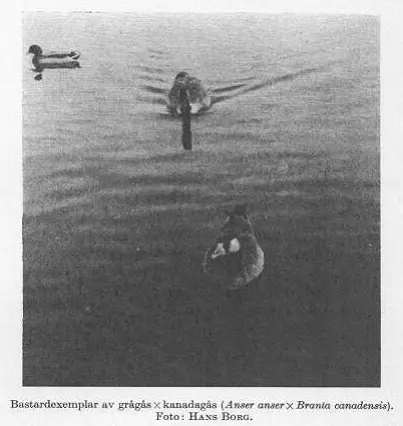 Hybridisering förekom redan i samband med de första utsättningarna och Gunnar Ekberg (1959) berättar om ”att avkomman till den i ett kanadagåsbo på Djäkneberget kläckte grågåshannen som vid mogen ålder äktade en kanadagås, besökt sin faders födelseplats flera gånger i vår och att en av dem avlade en kort visit där den 14 maj.” Möjligen var det detta omaka par tillsammans med fyra ungar, som Hans Borg (1962) iakttog vid Skanssjön i Hallstahammar 24-26 september 1961: ”Skanssjön i Hallstahammar… …där det finns… …kanadagäss, den sistnämnda arten om hösten i stora flockar. När jag den 24.9.1961 gick omkring vid sjön, fanns det massor av kanadagäss där. Plötsligt fick jag syn på ett ex. som hade ljusröd näbb. Jag gick närmare och kunde då se att den hade köttfärgade ben. [—] Den avvikande gåsen hade rödaktig näbb med svart spets, ett vitt band löpte runt näbbroten och vidare hade den ett smalt vitt streck under ögat. Den vita kindfläcken var mindre välutvecklad än hos en typisk kanadagås. Halsen var mera brun än svart, och de för Anser-arterna karakteristiska halsfjädrarna, som ser ut att vara ’vattenkammade’ fanns på denna fågel. Med hänsyn till dessa olika fakta slöt jag, att det var en bastard mellan grågås (Anser anser) och kanadagås (Branta canadensis). Denna dag såg jag två sådana bastarder. Senare på dagen kom jag åter till platsen. På stranden stod tillsammans en grå- och en kanadagås, och runt om dem simmade fyra bastarder. Nästa dag låg samtliga bastarder, tillsammans med de övriga kanadagässen, på andra sidan sjön. Följande dag igen hade jag turen att kunna fotografera en av bastarderna invid stranden.”.
