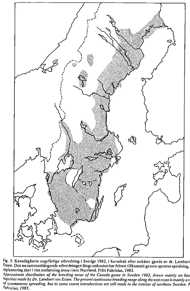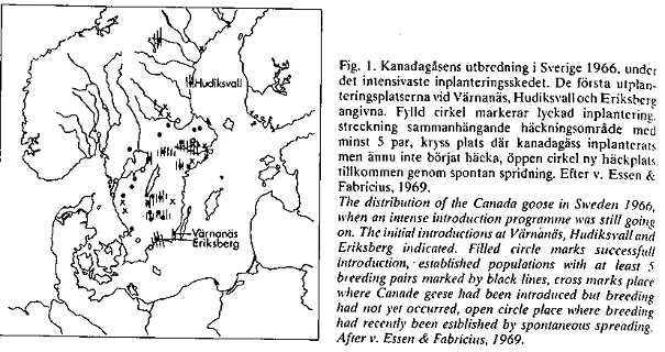 Ytterligare utsättningar gjordes i såväl Västmanland som i grannlandskap, men detta har jag inte lyckats hitta några närmare uppgifter om. Utsättningarna hade dock upphört på 1970-talet (Eric Fabricius 1983). Kanadagässen spred sig och ökade i antal ändå och spridningshastigheten uppskattades till 1-3 km per år (Eric Fabricius 1983). Kartorna nedan är hämtade från Eric Fabricius (1983) och visar kanadagåsens utbredning i Sverige 1966, 1971 respektive 1982. De visar att större delen av Västmanland hade intagits redan i början av 1970-talet. Utbredningskartan för år 1982 överensstämmer för Västmanlands del väl med inventeringsdata från perioden 1974-1984, se karta nedan.