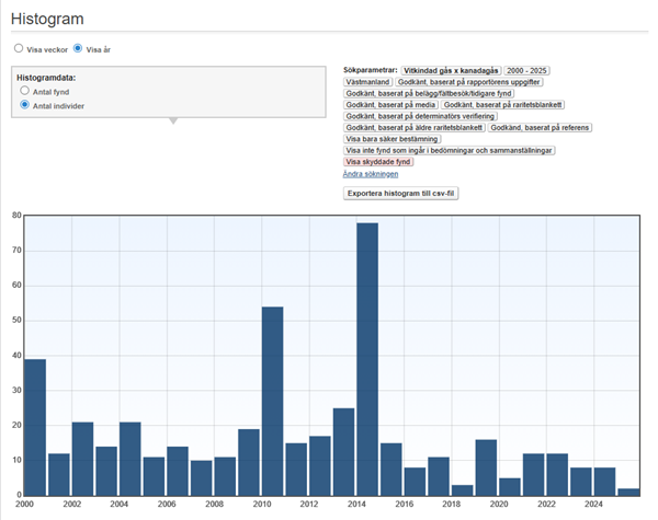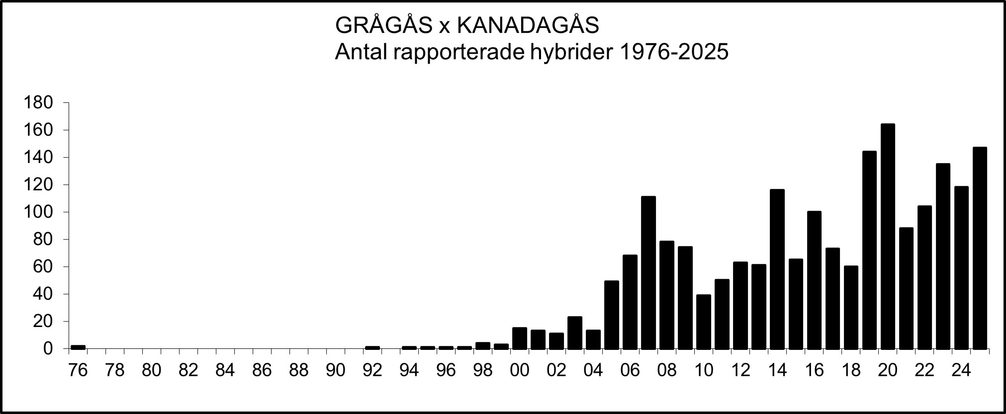 Rapporterade hybridhäckningar med vitkindad gås 1976-2025: