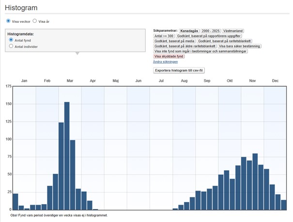 Veckovis fördelning av fynd av minst 300 ex. 2000-2025.