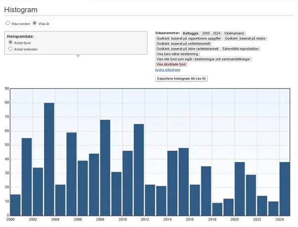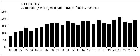 Antalet rutor (5×5 km) med fynd av kattuggla under perioden 2000-2024 indikerar en rätt stabil förekomst medan antalet rapporterade säkerställda häckningar, oftast genom observation av mattiggande ungar, visar en vikande tendens de två senaste decennierna. Möjligen indikerar detta en försämrad häckningsframgång.