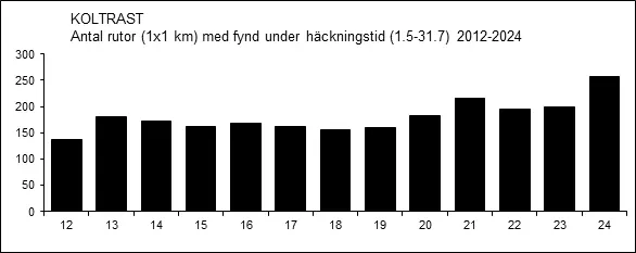 Koltrasten övervintrar regelbundet i anslutning till bebyggelse, mest frekvent i Mälarområdet och Skogslåglandet.