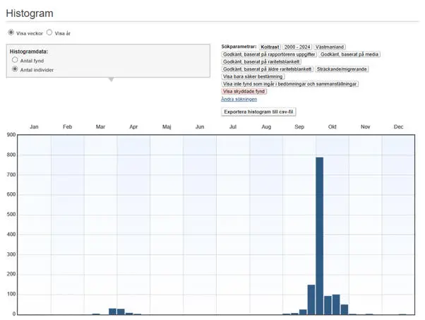 De högsta (minst 100 ex.) dagssummorna av koltrastar som har bedömts som sträckande 2000-2024: