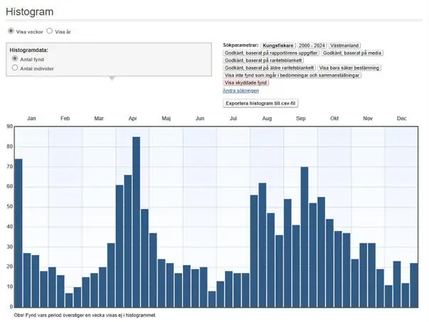 Kungsfiskaren kan ses praktiskt taget året om, men de flesta individer flyttar bort under hösten. Kungsfiskaren återkommer i april, tidiga år redan i mars. I histogrammet nedan syns frekvenstoppar både i april och i augusti. Den senare rör sannolikt ungfåglar under spridning. Toppen i april kan naturligtvis återspegla en sträcktopp, men kan samtidigt också vara ett uttryck för ökad ornitologisk aktivitet. Antalet fynd i januari är förhållandevis många, särskilt i jämförelse med månaderna maj, juni och juli, som är de månader på året då minst antal kungsfiskare ses i landskapet. Genomförda övervintringar är få och under perioden 2000-2024 har sammanlagt 68 individer svarat för den bedriften, som mest 6 ex. Det i särklass mest frekventerade området vintertid är Munkängen i Västerås.
